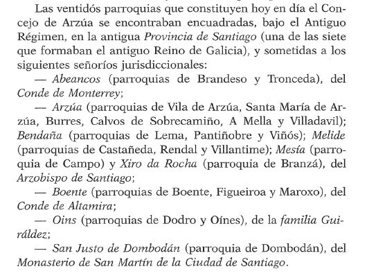 Ata 1833 o Reino de Galicia estivo dividido en sete provincias, unha delas era Santiago e a esa provincia pertencía o actual Concello de Arzúa. Jesús Barral-Guerín y Rouco, no número 279 da revista “Hidalguía: la revista de genealogía, nobleza y armas” (ano 2000), publicou un traballo titulado “Hidalgos avecindados y forasteros empadronados en las parroquias de la Villa de Arzúa en los libros del Catastro del Marqués de la Ensenada y algunas notas histórias y geográficas referentes a dicha villa”. O seguinte parágrafo está tirado literalmente dese traballo: